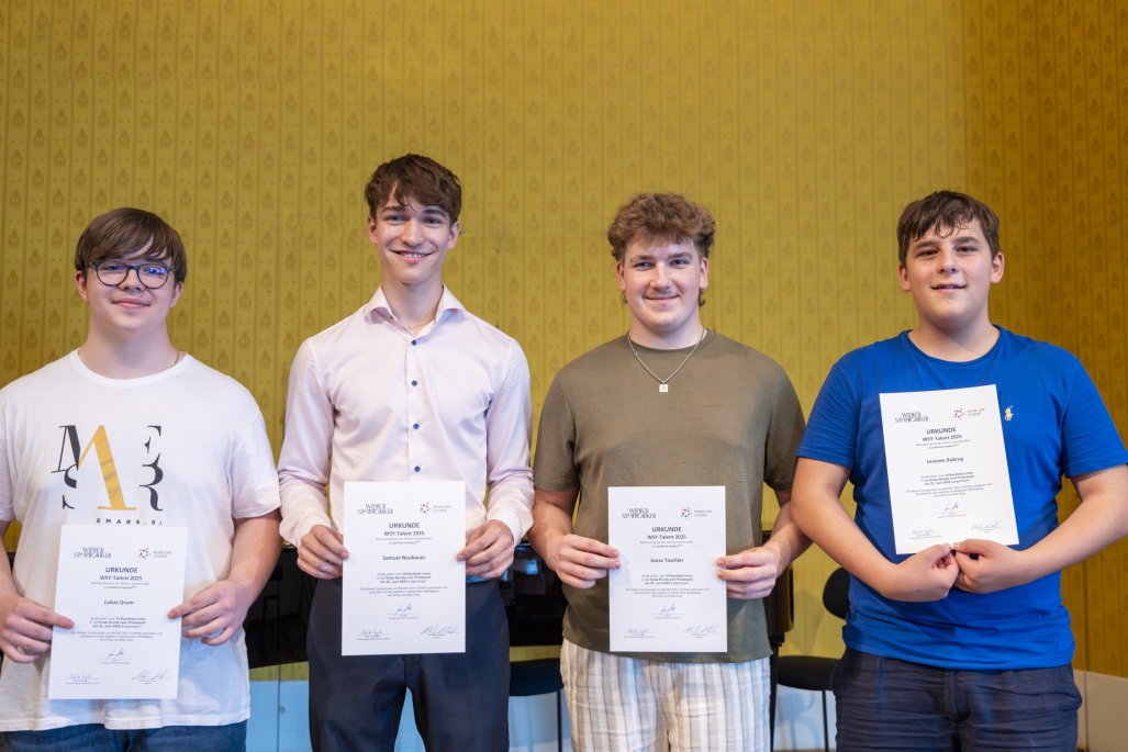 Die Wiener Symphoniker vergeben den Nachwuchspreis WSY-Talent seit der Saison 2020/21 in Kooperation mit dem Jugendmusikwettbewerb prima la musica an junge Talente. Dieses Jahr setzten sich Levente Bubreg am Fagott, Lukas Grum an der Flöte, Samuel Neubauer an der Klarinette und Jonas Taschler an der Posaune durch. Wir gratulieren herzlich und freuen uns auf das gemeinsame Musizieren!
